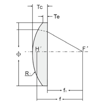尺寸圖說明: Φ- 直徑,R1- 半徑,Tc- 中心厚度,Te- 邊厚,f- 焦距,fb- 背焦