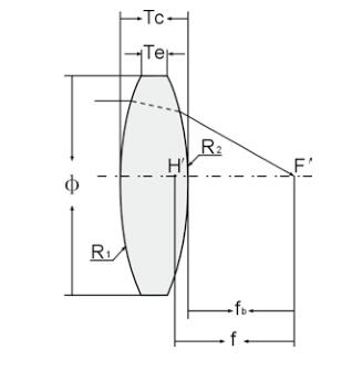 尺寸圖說明: Φ- 直徑,R1- 半徑,Tc- 中心厚度,Te- 邊厚,f- 焦距,fb- 背焦
